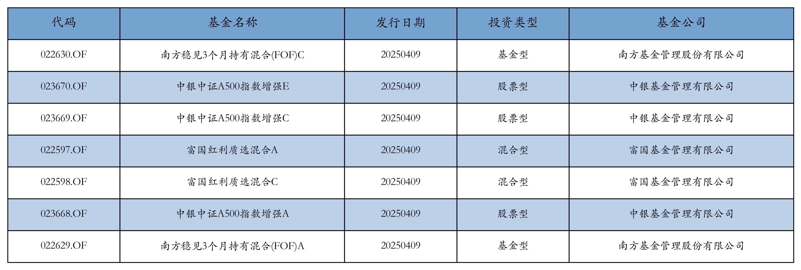 昨日有7只新基金发行,分别为:南方稳见3个月持有混合(FOF)C、中银中证A500指数增强E、中银中证A500指数增强C、富国红利质选混合A、富国红利质选混合C、中银中证A500指数增强A、南方稳见3个月持有混合(FOF)A,详情见下表: