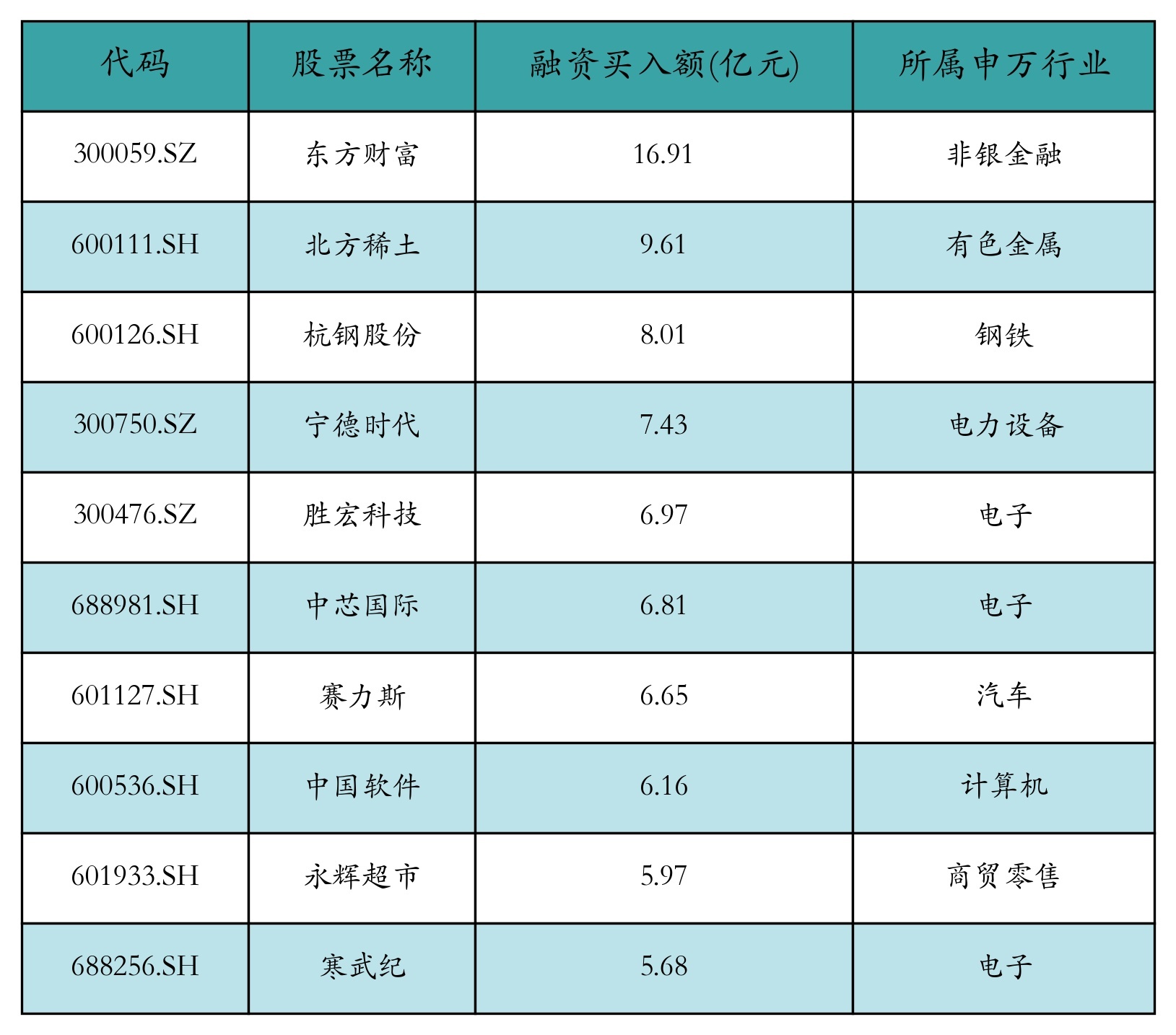 两市共有3411只个股有融资资金买入,其中东方财富、北方稀土、杭钢股份排名前三,买入金额分别16.91亿元、9.61亿元、8.01亿元。融资买入额前10个股详情见下表: